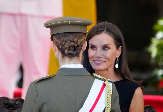 King Felipe VI (Le roi Felipe VI d'Espagne), Queen Letizia (La reine Letizia d'Espagne) and Crown Princess Leonor (La princesse Leonor) attend the delivery of Royal offices of employment at the Naval Military School on July 16, 2024 in Marin, Spain. © Lalo Yasky/Bestimage