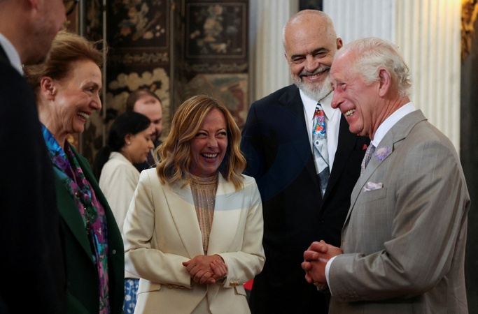 Britain's King Charles meets Albania's Prime Minister Edi Rama and Italy's Prime Minister Giorgia Meloni during the European Political Community meeting at Blenheim Palace, near Oxford, Britain July 18, 2024., Credit:Hollie Adams / Avalon