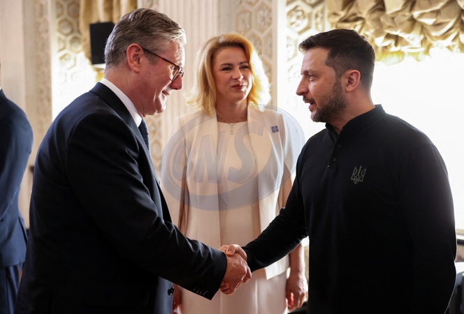 Ukrainian President Volodymyr Zelenskiy shakes hands with Britain's Prime Minister Keir Starmer during the European Political Community meeting at Blenheim Palace, near Oxford, Britain July 18, 2024., Credit:Hollie Adams / Avalon