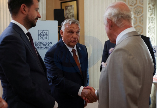 Britain's King Charles shakes hands with Hungarian Prime Minister Viktor Orban during the European Political Community meeting at Blenheim Palace, near Oxford, Britain July 18, 2024., Credit:Hollie Adams / Avalon