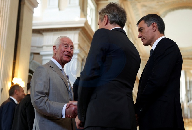 Britain's King Charles stands next to Spain's Prime Minister Pedro Sanchez during the European Political Community meeting at Blenheim Palace, near Oxford, Britain July 18, 2024., Credit:Hollie Adams / Avalon