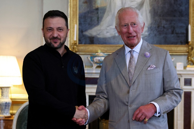 Britain's King Charles shakes hands with Ukrainian President Volodymyr Zelenskiy as they attend an audience during the European Political Community meeting at Blenheim Palace, near Oxford, Britain July 18, 2024., Credit:Hollie Adams / Avalon