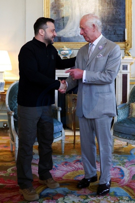 Britain's King Charles shakes hands with Ukrainian President Volodymyr Zelenskiy as they attend an audience during the European Political Community meeting at Blenheim Palace, near Oxford, Britain July 18, 2024., Credit:Hollie Adams / Avalon