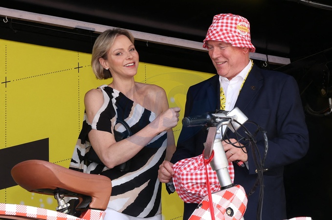 Le Prince Albert et la Princesse Charlène de Monaco - Le prince Albert II de Monaco et la princesse Charlene ont reçu un cadeau insolite : un Solex éléctrique aux couleurs de la célébre marque Cochonou. La marque aux couleurs Rouge et Blanche et ses fameux "bob" on séduit la princesse qui s'en est amusé en couvrant son mari avec dans un fou rire partagé. - Le prince Albert II de Monaco et la princesse Charlene ont donné le départ de la dernière étape du Tour de France 2024, un contre la montre entre Monaco et Nice en compagnie de Christian Estrosi, le maire de Nice, sa femme, Laura Tenoudji et Christian Prudhomme, le directeur du Tour de France, le 21 juillet 2024. Ce Tour est remporté pour la troisième fois par le Slovène Tadej Pogačar, UAE Team Emirates avec une sixième victoire d'étape, en s'imposant au contre-la-montre final. © Claudia Albuquerque/Bestimage Prince Albert II of Monaco and Princess Charlene received an unusual gift: an electric Solex in the colors of the famous Cochonou brand. The brand with its red and white colors and its famous "bob" caps won over the princess, who had fun covering her husband with it in a shared fit of laughter - Prince Albert II of Monaco and Princess Charlene gave the start to the final stage of the 2024 Tour de France, a time trial between Monaco and Nice in the company of Christian Estrosi, the mayor of Nice, his wife, Laura Tenoudji and Christian Prudhomme, the director of the Tour de France, on July 21, 2024. This Tour is won for the third time by the Slovenian Tadej Pogačar, UAE Team Emirates with a sixth stage victory, by winning the final time trial.
