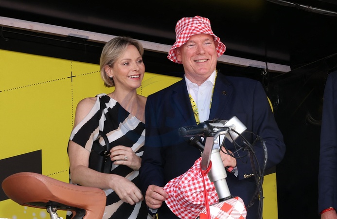 Le Prince Albert et la Princesse Charlène de Monaco - Le prince Albert II de Monaco et la princesse Charlene ont reçu un cadeau insolite : un Solex éléctrique aux couleurs de la célébre marque Cochonou. La marque aux couleurs Rouge et Blanche et ses fameux "bob" on séduit la princesse qui s'en est amusé en couvrant son mari avec dans un fou rire partagé. - Le prince Albert II de Monaco et la princesse Charlene ont donné le départ de la dernière étape du Tour de France 2024, un contre la montre entre Monaco et Nice en compagnie de Christian Estrosi, le maire de Nice, sa femme, Laura Tenoudji et Christian Prudhomme, le directeur du Tour de France, le 21 juillet 2024. Ce Tour est remporté pour la troisième fois par le Slovène Tadej Pogačar, UAE Team Emirates avec une sixième victoire d'étape, en s'imposant au contre-la-montre final. © Claudia Albuquerque/Bestimage Prince Albert II of Monaco and Princess Charlene received an unusual gift: an electric Solex in the colors of the famous Cochonou brand. The brand with its red and white colors and its famous "bob" caps won over the princess, who had fun covering her husband with it in a shared fit of laughter - Prince Albert II of Monaco and Princess Charlene gave the start to the final stage of the 2024 Tour de France, a time trial between Monaco and Nice in the company of Christian Estrosi, the mayor of Nice, his wife, Laura Tenoudji and Christian Prudhomme, the director of the Tour de France, on July 21, 2024. This Tour is won for the third time by the Slovenian Tadej Pogačar, UAE Team Emirates with a sixth stage victory, by winning the final time trial.