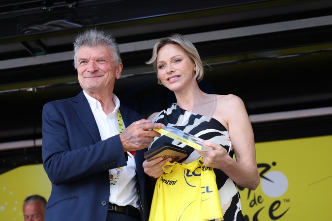 Bernard Thévenet, la princesse Charlene de Monaco - Le prince Albert II de Monaco et la princesse Charlene ont donné le départ de la dernière étape du Tour de France 2024, un contre la montre entre Monaco et Nice en compagnie de Christian Estrosi, le maire de Nice, sa femme, Laura Tenoudji et Christian Prudhomme, le directeur du Tour de France, le 21 juillet 2024. Ce Tour est remporté pour la troisième fois par le Slovène Tadej Pogačar, UAE Team Emirates avec une sixième victoire d'étape, en s'imposant au contre-la-montre final. © Claudia Albuquerque/Bestimage Prince Albert II of Monaco and Princess Charlene received an unusual gift: an electric Solex in the colors of the famous Cochonou brand. The brand with its red and white colors and its famous "bob" caps won over the princess, who had fun covering her husband with it in a shared fit of laughter - Prince Albert II of Monaco and Princess Charlene gave the start to the final stage of the 2024 Tour de France, a time trial between Monaco and Nice in the company of Christian Estrosi, the mayor of Nice, his wife, Laura Tenoudji and Christian Prudhomme, the director of the Tour de France, on July 21, 2024. This Tour is won for the third time by the Slovenian Tadej Pogačar, UAE Team Emirates with a sixth stage victory, by winning the final time trial.
