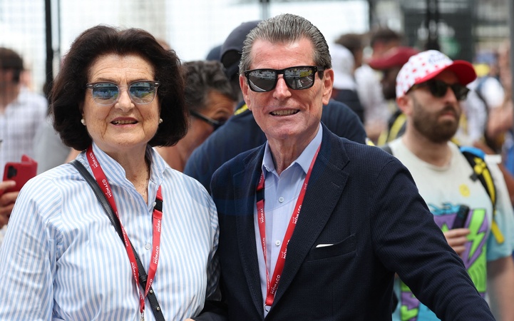 Yvette Lambin Berti, la secrétaire général du Comité Olympique Monégasque et son mari - Le prince Albert II de Monaco et la princesse Charlene ont donné le départ de la dernière étape du Tour de France 2024, un contre la montre entre Monaco et Nice en compagnie de Christian Estrosi, le maire de Nice, sa femme, Laura Tenoudji et Christian Prudhomme, le directeur du Tour de France, le 21 juillet 2024. Ce Tour est remporté pour la troisième fois par le Slovène Tadej Pogačar, UAE Team Emirates avec une sixième victoire d'étape, en s'imposant au contre-la-montre final. © Claudia Albuquerque/Bestimage Prince Albert II of Monaco and Princess Charlene received an unusual gift: an electric Solex in the colors of the famous Cochonou brand. The brand with its red and white colors and its famous "bob" caps won over the princess, who had fun covering her husband with it in a shared fit of laughter - Prince Albert II of Monaco and Princess Charlene gave the start to the final stage of the 2024 Tour de France, a time trial between Monaco and Nice in the company of Christian Estrosi, the mayor of Nice, his wife, Laura Tenoudji and Christian Prudhomme, the director of the Tour de France, on July 21, 2024. This Tour is won for the third time by the Slovenian Tadej Pogačar, UAE Team Emirates with a sixth stage victory, by winning the final time trial.