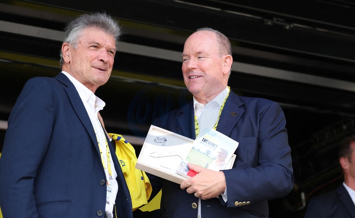Bernard Thévenet, le prince Albert II de Monaco - Le prince Albert II de Monaco et la princesse Charlene ont donné le départ de la dernière étape du Tour de France 2024, un contre la montre entre Monaco et Nice en compagnie de Christian Estrosi, le maire de Nice, sa femme, Laura Tenoudji et Christian Prudhomme, le directeur du Tour de France, le 21 juillet 2024. Ce Tour est remporté pour la troisième fois par le Slovène Tadej Pogačar, UAE Team Emirates avec une sixième victoire d'étape, en s'imposant au contre-la-montre final. © Claudia Albuquerque/Bestimage Prince Albert II of Monaco and Princess Charlene received an unusual gift: an electric Solex in the colors of the famous Cochonou brand. The brand with its red and white colors and its famous "bob" caps won over the princess, who had fun covering her husband with it in a shared fit of laughter - Prince Albert II of Monaco and Princess Charlene gave the start to the final stage of the 2024 Tour de France, a time trial between Monaco and Nice in the company of Christian Estrosi, the mayor of Nice, his wife, Laura Tenoudji and Christian Prudhomme, the director of the Tour de France, on July 21, 2024. This Tour is won for the third time by the Slovenian Tadej Pogačar, UAE Team Emirates with a sixth stage victory, by winning the final time trial.