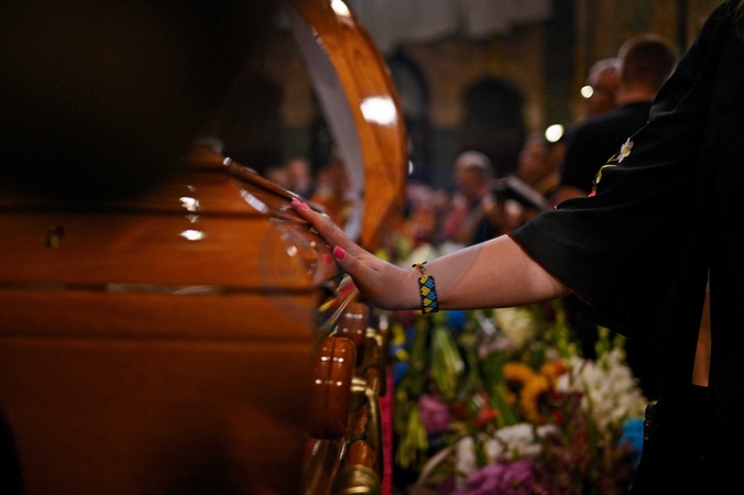LVIV, UKRAINE - JULY 21, 2024 - A woman with a patriotic bracelet made of blue and yellow ribbons touches the coffin of linguistic professor and former MP Iryna Farion, who was shot dead on the street on July 19, during the memorial service at the Saints Peter and Paul Garrison Church, Lviv, western Ukraine., Credit:Anastasiia Smolienko / Avalon