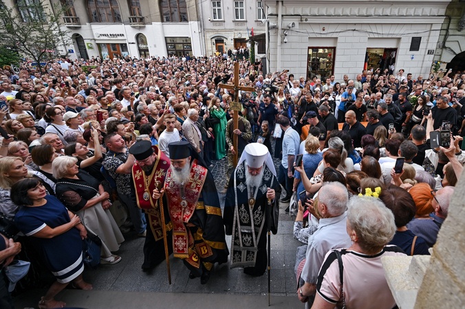LVIV, UKRAINE - JULY 21, 2024 - Priests walk ahead of men carrying the coffin with the body of linguistic professor and former MP Iryna Farion, who was shot dead on the street on July 19, to the Saints Peter and Paul Garrison Church, Lviv, western Ukraine., Credit:Anastasiia Smolienko / Avalon