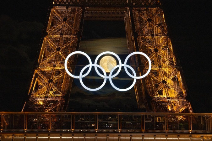 Illustrations de la pleine lune alignée sur les anneaux olympiques de la Tour Eiffel à Paris, le 20 juillet 2024. Illustrations of the full moon aligned with the Olympic rings of the Eiffel Tower in Paris, July 20, 2024.