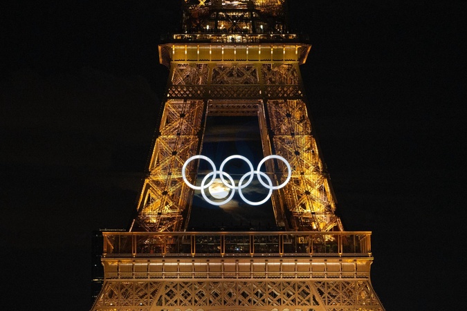 Illustrations de la pleine lune alignée sur les anneaux olympiques de la Tour Eiffel à Paris, le 20 juillet 2024. Illustrations of the full moon aligned with the Olympic rings of the Eiffel Tower in Paris, July 20, 2024.