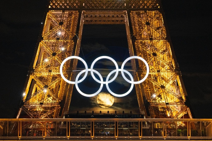 Illustrations de la pleine lune alignée sur les anneaux olympiques de la Tour Eiffel à Paris, le 20 juillet 2024. Illustrations of the full moon aligned with the Olympic rings of the Eiffel Tower in Paris, July 20, 2024.