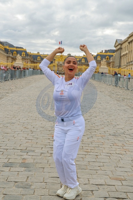 Salma Hayek porteuse de la flamme olympique des Jeux Olympiques de Paris 2024 (JO) au château de Versailles dans les Yvelines