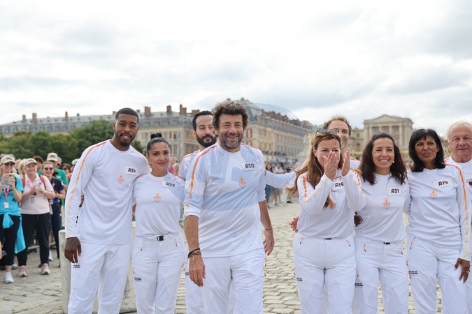 Salma Hayek et Patrick Bruel porteurs de la flamme olympique des Jeux Olympiques de Paris 2024 (JO) au château de Versailles dans les Yvelines, France, le 23 juillet 2024. © Dominique Jacovides/Bestimage Salma Hayek carrying the Olympic flame for the Paris 2024 Olympic Games (Olympics) at the Versailles Palace, Yvelines, France, on July 23, 2024.