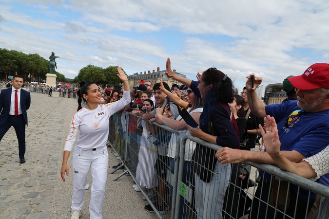 Salma Hayek porteuse de la flamme olympique des Jeux Olympiques de Paris 2024 (JO) au château de Versailles dans les Yvelines