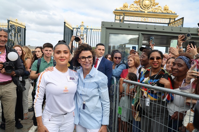 Salma Hayek porteuse de la flamme olympique des Jeux Olympiques de Paris 2024 (JO) avec Rachida Dati, ministre de la Culture, au château de Versailles dans les Yvelines, France, le 23 juillet 2024. © Dominique Jacovides/Bestimage Salma Hayek carrying the Olympic flame for the Paris 2024 Olympic Games (Olympics) at the Versailles Palace, Yvelines, France, on July 23, 2024.
