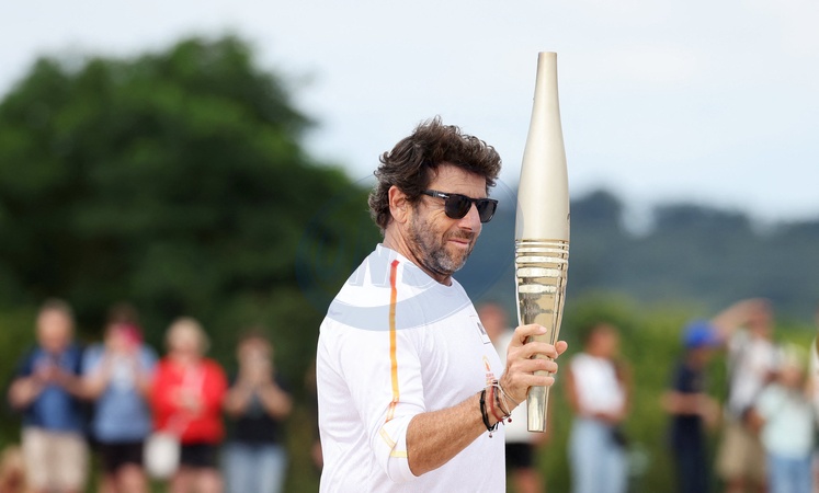 Le chanteur et acteur Patrick Bruel porteur de la flamme olympique des Jeux Olympiques de Paris 2024 (JO) au château de Versailles dans les Yvelines, France, le 23 juillet 2024. © Dominique Jacovides/Bestimage French singer and actor Patrick Bruel carries the Olympic flame of the Paris 2024 Olympic Games (Olympics) at the Palace of Versailles, Yvelines, France, on July 23, 2024.