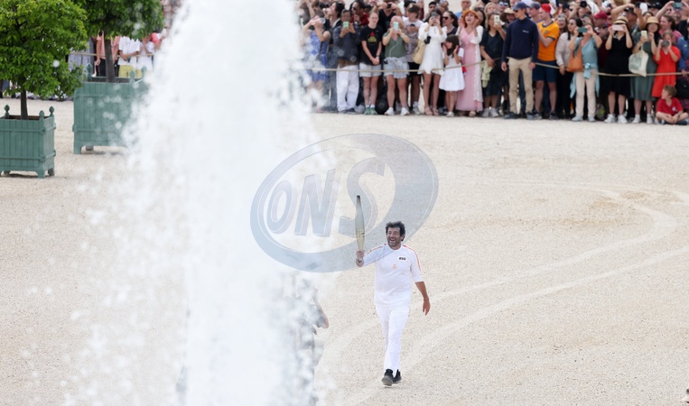 Le chanteur et acteur Patrick Bruel porteur de la flamme olympique des Jeux Olympiques de Paris 2024 (JO) au château de Versailles dans les Yvelines, France, le 23 juillet 2024. © Dominique Jacovides/Bestimage French singer and actor Patrick Bruel carries the Olympic flame of the Paris 2024 Olympic Games (Olympics) at the Palace of Versailles, Yvelines, France, on July 23, 2024.
