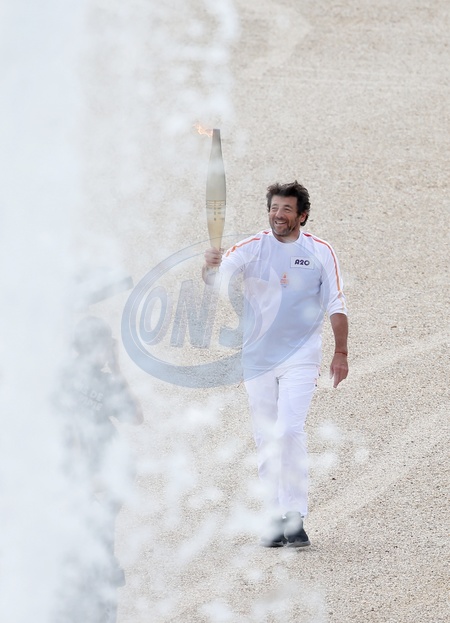 Le chanteur et acteur Patrick Bruel porteur de la flamme olympique des Jeux Olympiques de Paris 2024 (JO) au château de Versailles dans les Yvelines, France, le 23 juillet 2024. © Dominique Jacovides/Bestimage French singer and actor Patrick Bruel carries the Olympic flame of the Paris 2024 Olympic Games (Olympics) at the Palace of Versailles, Yvelines, France, on July 23, 2024.
