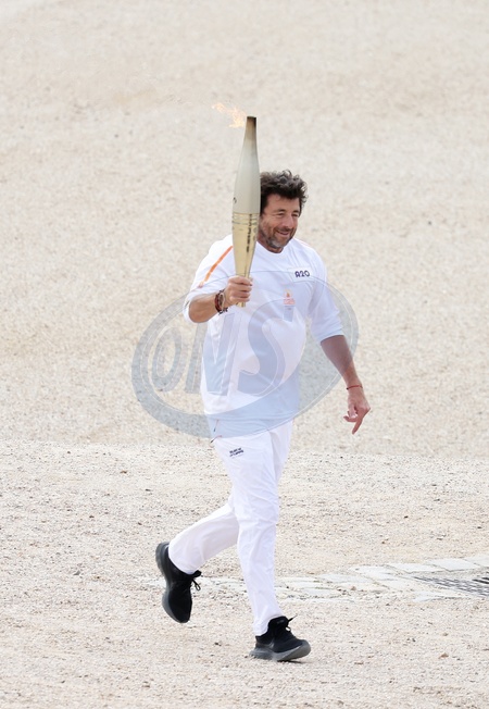 Le chanteur et acteur Patrick Bruel porteur de la flamme olympique des Jeux Olympiques de Paris 2024 (JO) au château de Versailles dans les Yvelines, France, le 23 juillet 2024. © Dominique Jacovides/Bestimage French singer and actor Patrick Bruel carries the Olympic flame of the Paris 2024 Olympic Games (Olympics) at the Palace of Versailles, Yvelines, France, on July 23, 2024.