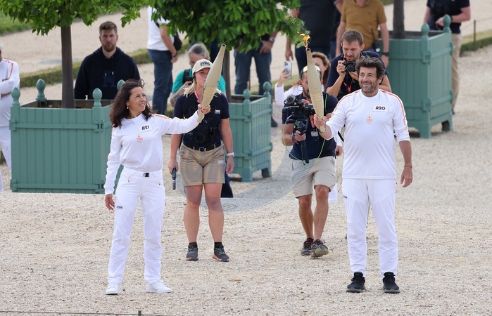 Salma Hayek et Patrick Bruel portent la flamme olympique des Jeux Olympiques de Paris 2024 (JO) au château de Versailles
