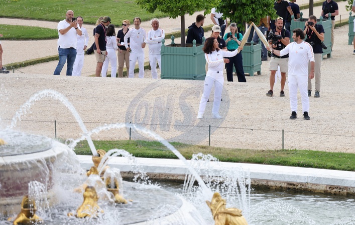 Salma Hayek et Patrick Bruel portent la flamme olympique des Jeux Olympiques de Paris 2024 (JO) au château de Versailles