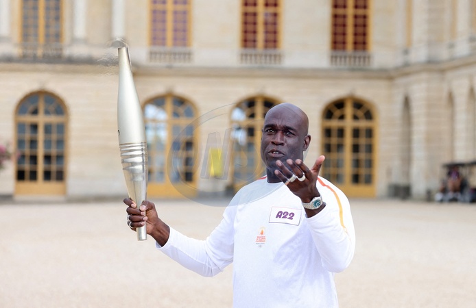Steve Toussaint porteur de la flamme olympique des Jeux Olympiques de Paris 2024 (JO) au château de Versailles dans les Yvelines, France, le 23 juillet 2024. © Dominique Jacovides/Bestimage