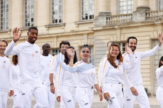 Presnel Kimpembe, Patrick Bruel, Mathieu Forget, Salma Hayek porteurs de la flamme olympique des Jeux Olympiques de Paris 2024 (JO) au château de Versailles dans les Yvelines, France, le 23 juillet 2024. © Dominique Jacovides/Bestimage