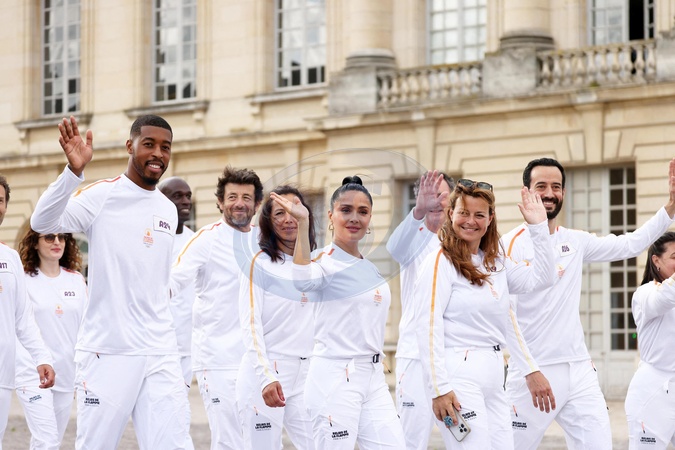 Presnel Kimpembe, Patrick Bruel, Mathieu Forget, Salma Hayek porteurs de la flamme olympique des Jeux Olympiques de Paris 2024 (JO) au château de Versailles dans les Yvelines, France, le 23 juillet 2024. © Dominique Jacovides/Bestimage