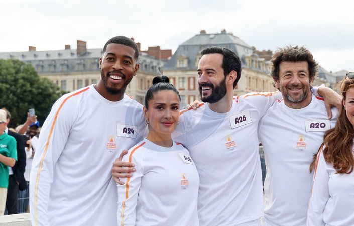 Salma Hayek et Patrick Bruel portent la flamme olympique des Jeux Olympiques de Paris 2024 (JO) au château de Versailles