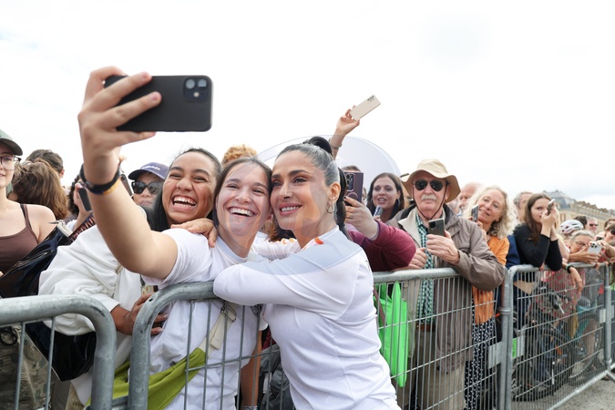 Salma Hayek porteuse de la flamme olympique des Jeux Olympiques de Paris 2024 (JO) au château de Versailles dans les Yvelines, France, le 23 juillet 2024. © Dominique Jacovides/Bestimage Salma Hayek carrying the Olympic flame for the Paris 2024 Olympic Games (Olympics) at the Versailles Palace, Yvelines, France, on July 23, 2024.