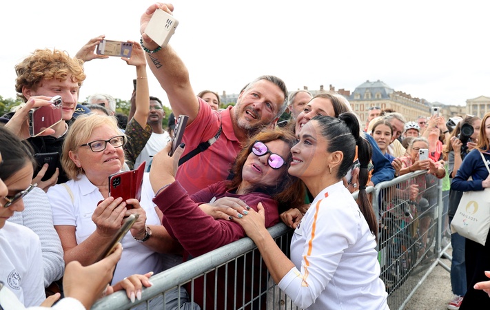 Salma Hayek porteuse de la flamme olympique des Jeux Olympiques de Paris 2024 (JO) au château de Versailles dans les Yvelines, France, le 23 juillet 2024. © Dominique Jacovides/Bestimage Salma Hayek carrying the Olympic flame for the Paris 2024 Olympic Games (Olympics) at the Versailles Palace, Yvelines, France, on July 23, 2024.