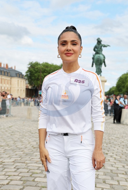 Salma Hayek porteuse de la flamme olympique des Jeux Olympiques de Paris 2024 (JO) au château de Versailles dans les Yvelines, France, le 23 juillet 2024. © Dominique Jacovides/Bestimage Salma Hayek carrying the Olympic flame for the Paris 2024 Olympic Games (Olympics) at the Versailles Palace, Yvelines, France, on July 23, 2024.