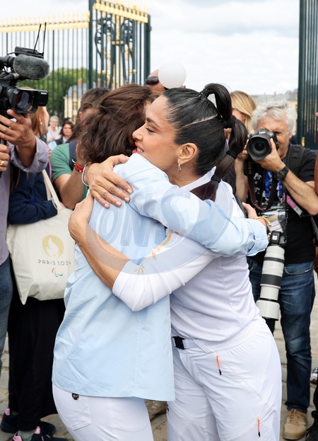 Rachida Dati, Salma Hayek porteuse de la flamme olympique des Jeux Olympiques de Paris 2024 (JO) au château de Versailles dans les Yvelines, France, le 23 juillet 2024. © Dominique Jacovides/Bestimage Salma Hayek carrying the Olympic flame for the Paris 2024 Olympic Games (Olympics) at the Versailles Palace, Yvelines, France, on July 23, 2024.