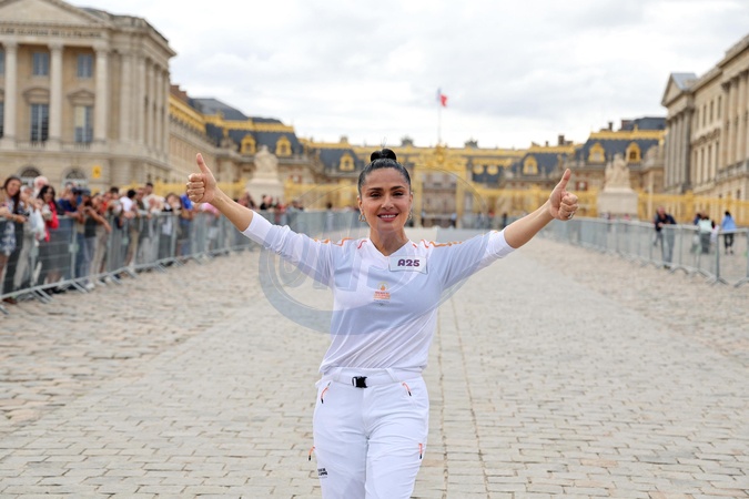 Salma Hayek et Patrick Bruel portent la flamme olympique des Jeux Olympiques de Paris 2024 (JO) au château de Versailles