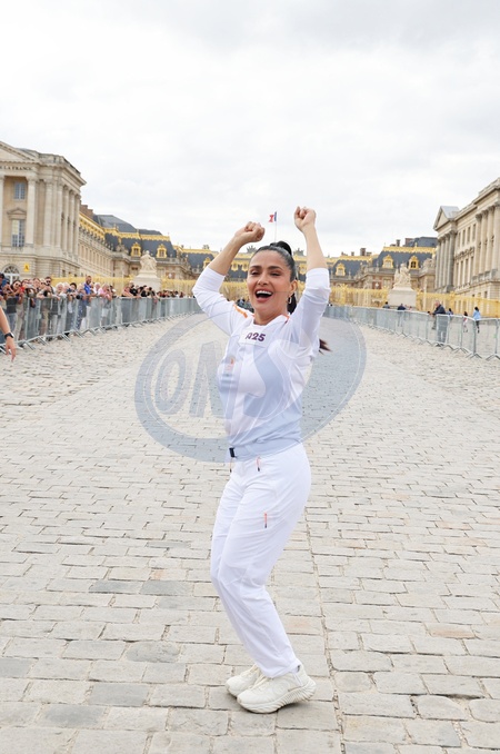 Salma Hayek porteuse de la flamme olympique des Jeux Olympiques de Paris 2024 (JO) au château de Versailles dans les Yvelines, France, le 23 juillet 2024. © Dominique Jacovides/Bestimage Salma Hayek carrying the Olympic flame for the Paris 2024 Olympic Games (Olympics) at the Versailles Palace, Yvelines, France, on July 23, 2024.