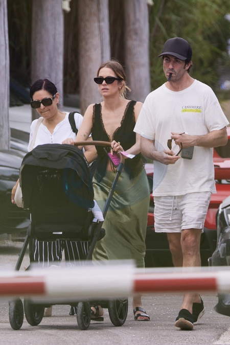 Exclusif - Ashley Benson et son mari Brandon Davis avec leur fille Aspen Davis (en poussette) à la sortie du Club 55 à Saint-Tropez, Côte d'Azur, France, le 21 juillet 2024. No Web pour la Belgique et la Suisse Exclusive - For Germany Call For Price - Ashley Benson and her husband Brandon Davis with their daughter Aspen Davis (in stroller) leaving Club 55 in Saint-Tropez, French Riviera, France, on July 21, 2024.