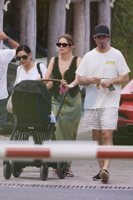 Exclusif - Ashley Benson et son mari Brandon Davis avec leur fille Aspen Davis (en poussette) à la sortie du Club 55 à Saint-Tropez, Côte d'Azur, France, le 21 juillet 2024. No Web pour la Belgique et la Suisse Exclusive - For Germany Call For Price - Ashley Benson and her husband Brandon Davis with their daughter Aspen Davis (in stroller) leaving Club 55 in Saint-Tropez, French Riviera, France, on July 21, 2024.