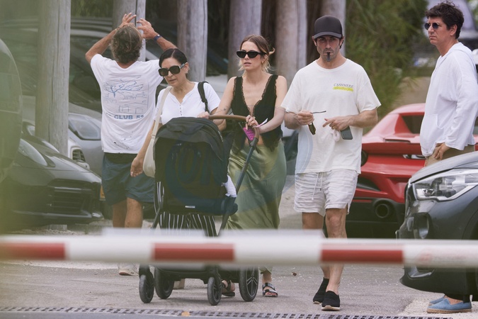 Exclusif - Ashley Benson et son mari Brandon Davis avec leur fille Aspen Davis (en poussette) à la sortie du Club 55 à Saint-Tropez, Côte d'Azur, France, le 21 juillet 2024. No Web pour la Belgique et la Suisse Exclusive - For Germany Call For Price - Ashley Benson and her husband Brandon Davis with their daughter Aspen Davis (in stroller) leaving Club 55 in Saint-Tropez, French Riviera, France, on July 21, 2024.