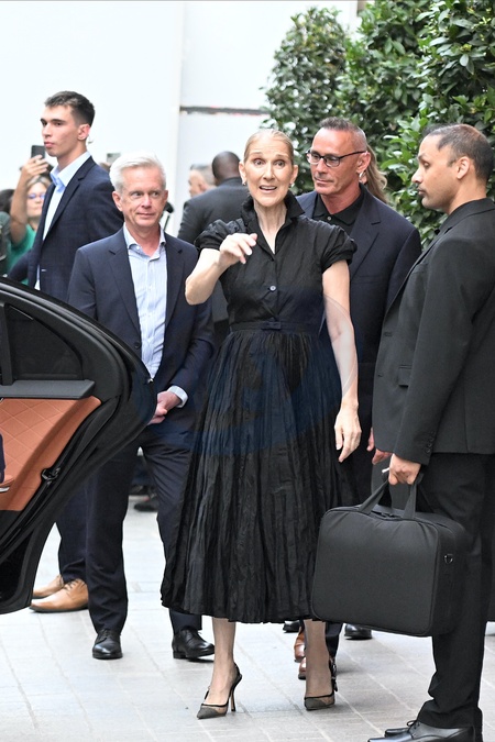 Céline Dion à la sortie de l'hôtel Royal Monceau à Paris avant l'ouverture des Jeux Olympiques (JO) de Paris 2024, à Paris, France, le 24 juillet 2024. Céline Dion leaving the Royal Monceau hotel in Paris before the opening of the Paris 2024 Olympic Games (JO), in Paris, France, July 24, 2024.