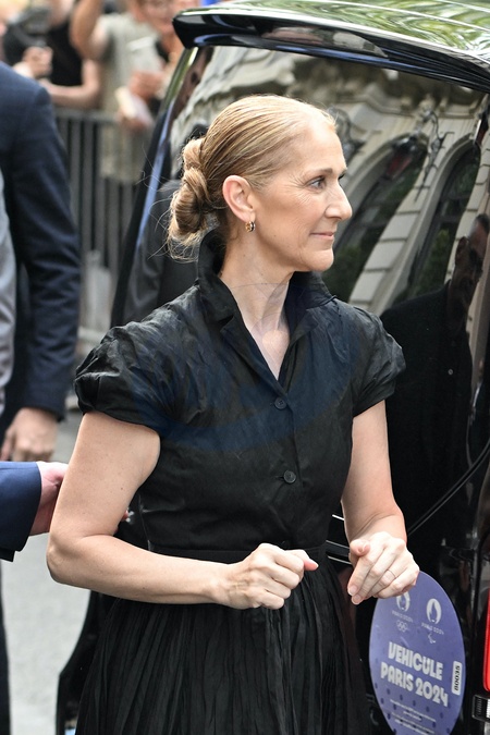 Céline Dion à la sortie de l'hôtel Royal Monceau à Paris avant l'ouverture des Jeux Olympiques (JO) de Paris 2024, à Paris, France, le 24 juillet 2024. Céline Dion leaving the Royal Monceau hotel in Paris before the opening of the Paris 2024 Olympic Games (JO), in Paris, France, July 24, 2024.