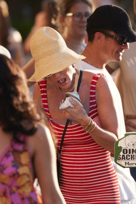 Semi-Exclusif - No Web - Katy Perry et son fiancé Orlando Bloom avec leur fille Daisy se baladent sur le port de Saint-Tropez, le 14 juillet 2024. Merci de flouter le visage des enfants avant publication Semi-Exclusive - No Web - Katy Perry and her fiancé Orlando Bloom with their daughter Daisy stroll on the port of Saint-Tropez, July 14, 2024.