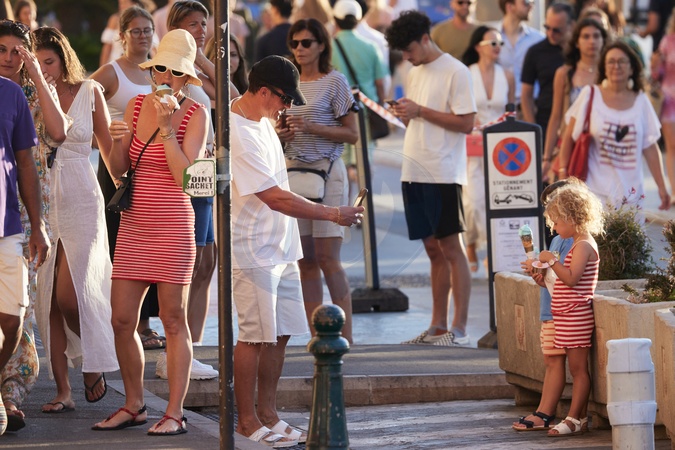 Semi-Exclusif - No Web - Katy Perry et son fiancé Orlando Bloom avec leur fille Daisy se baladent sur le port de Saint-Tropez, le 14 juillet 2024. Merci de flouter le visage des enfants avant publication Semi-Exclusive - No Web - Katy Perry and her fiancé Orlando Bloom with their daughter Daisy stroll on the port of Saint-Tropez, July 14, 2024.
