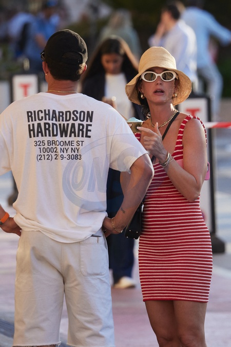 Semi-Exclusif - No Web - Katy Perry et son fiancé Orlando Bloom avec leur fille Daisy se baladent sur le port de Saint-Tropez, le 14 juillet 2024. Merci de flouter le visage des enfants avant publication Semi-Exclusive - No Web - Katy Perry and her fiancé Orlando Bloom with their daughter Daisy stroll on the port of Saint-Tropez, July 14, 2024.