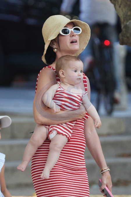Semi-Exclusif - No Web - Katy Perry et son fiancé Orlando Bloom avec leur fille Daisy se baladent sur le port de Saint-Tropez, le 14 juillet 2024. Merci de flouter le visage des enfants avant publication Semi-Exclusive - No Web - Katy Perry and her fiancé Orlando Bloom with their daughter Daisy stroll on the port of Saint-Tropez, July 14, 2024.