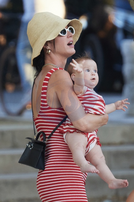 Semi-Exclusif - No Web - Katy Perry et son fiancé Orlando Bloom avec leur fille Daisy se baladent sur le port de Saint-Tropez, le 14 juillet 2024. Merci de flouter le visage des enfants avant publication Semi-Exclusive - No Web - Katy Perry and her fiancé Orlando Bloom with their daughter Daisy stroll on the port of Saint-Tropez, July 14, 2024.