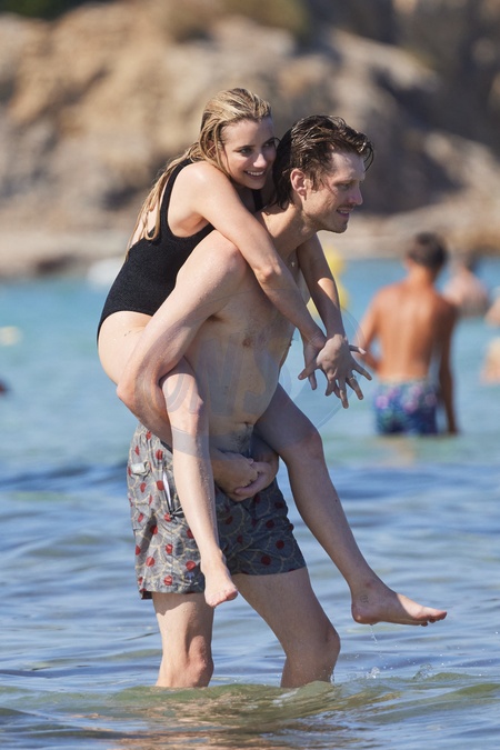 Exclusif - Prix Spécial - No Web - Ashley Benson, son mari Brandon Davis, Emma Roberts et son fiancé Cody John s'amusent comme de grands enfants sur une plage pendant leurs vacances dans le golfe de Saint-Tropez, Côte d'Azur, France, le 25 juillet 2025. Exclusive - For Germany Call For Prize - Must Call For Pricing Before Usage - Ashley Benson, her husband Brandon Davis, Emma Roberts and her companion Cody John have fun like big kids on a beach during their vacation in the Gulf of Saint-Tropez, French Riviera, France, on July 25, 2025.