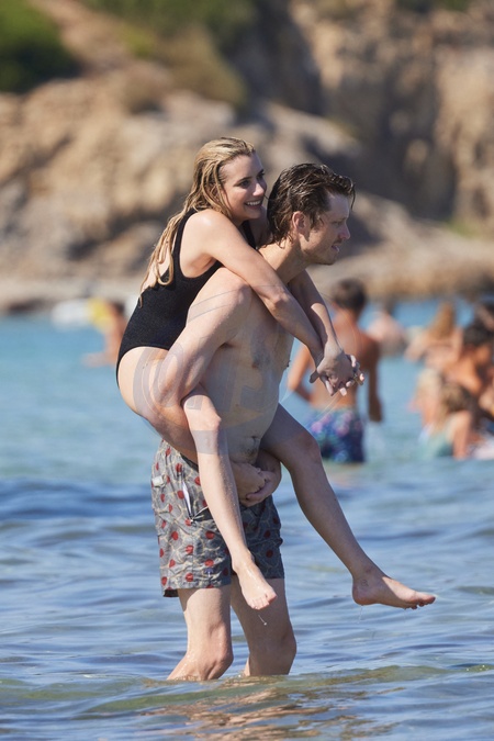 Ashley Benson, jej mąż Brandon Davis, Emma Roberts i jej narzeczony Cody John bawią się jak duże dzieci na plaży podczas wakacji w Zatoce Saint-Tropez