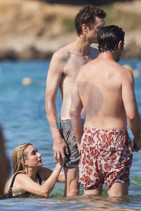 Exclusif - Prix Spécial - No Web - Ashley Benson, son mari Brandon Davis, Emma Roberts et son fiancé Cody John s'amusent comme de grands enfants sur une plage pendant leurs vacances dans le golfe de Saint-Tropez, Côte d'Azur, France, le 25 juillet 2025. Exclusive - For Germany Call For Prize - Must Call For Pricing Before Usage - Ashley Benson, her husband Brandon Davis, Emma Roberts and her companion Cody John have fun like big kids on a beach during their vacation in the Gulf of Saint-Tropez, French Riviera, France, on July 25, 2025.